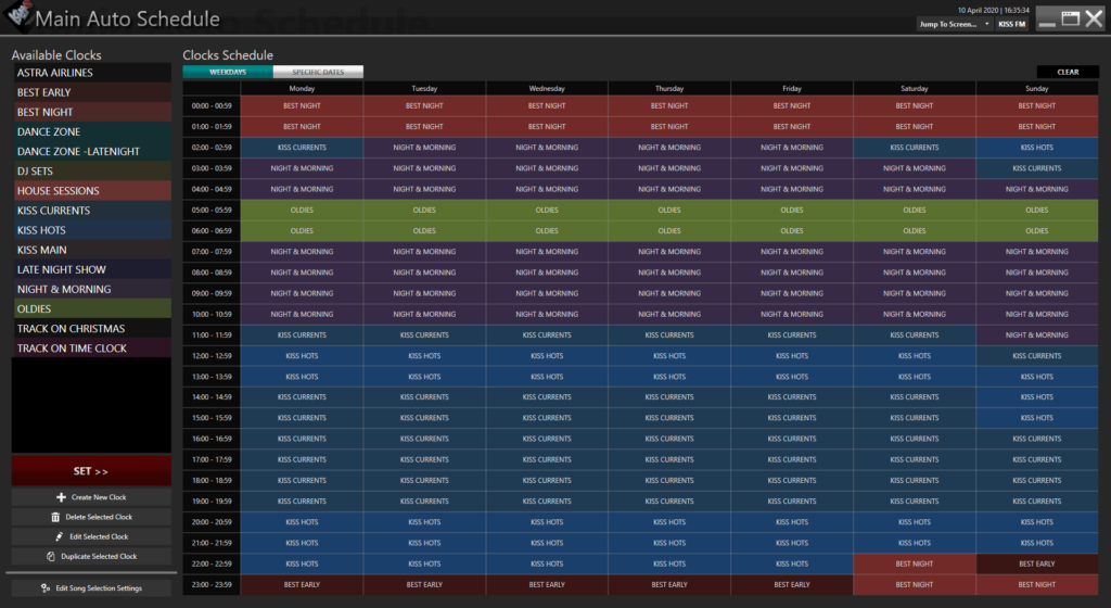 El editor de relojes es donde crea la base de su programación musical. Cada reloj puede tener un color diferente para ver claramente a qué horas están activos. También puede cambiar en masa cualquier día y posición de sus relojes. Todas las herramientas necesarias para crear un reloj están aquí. En SOHO también puede seleccionar una categoría de respaldo para usar en caso de que una selección falle o necesite completar la hora programada.
